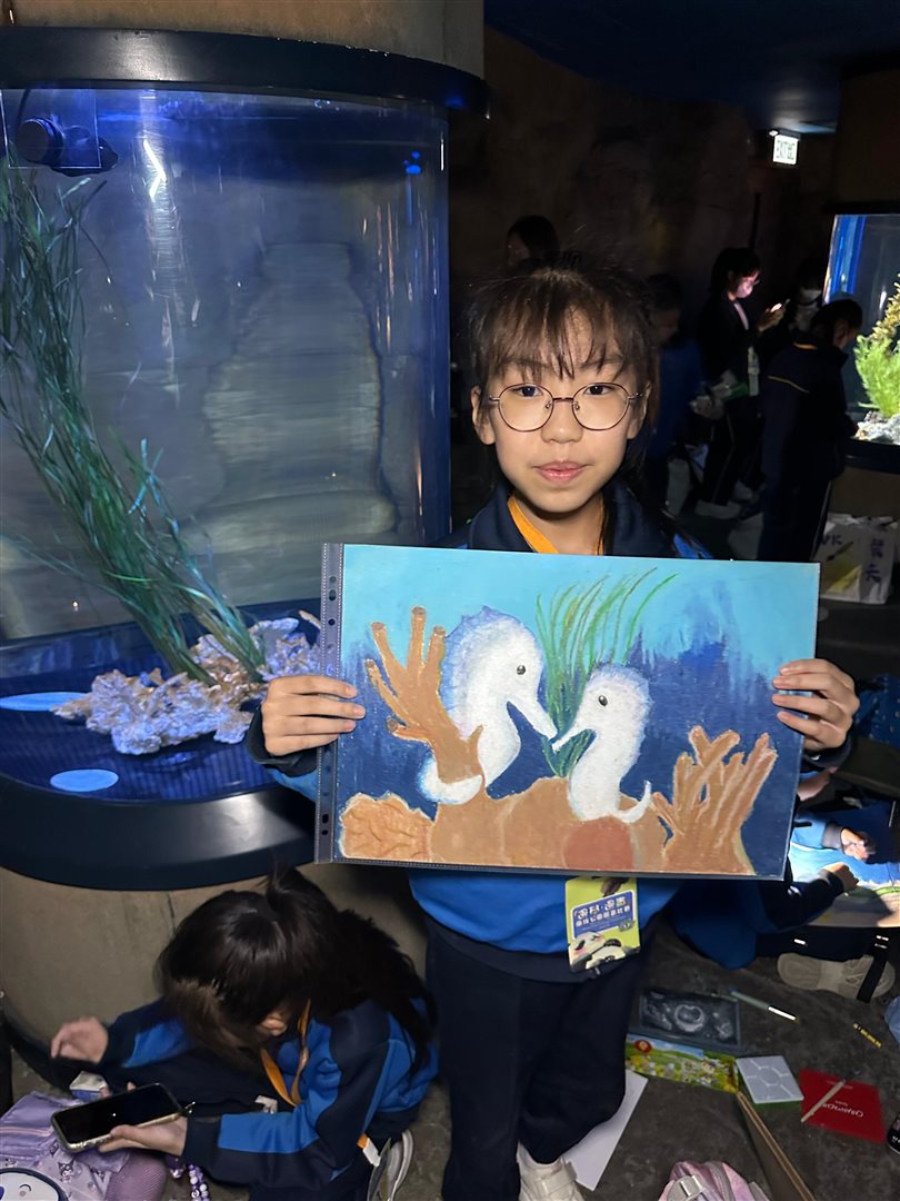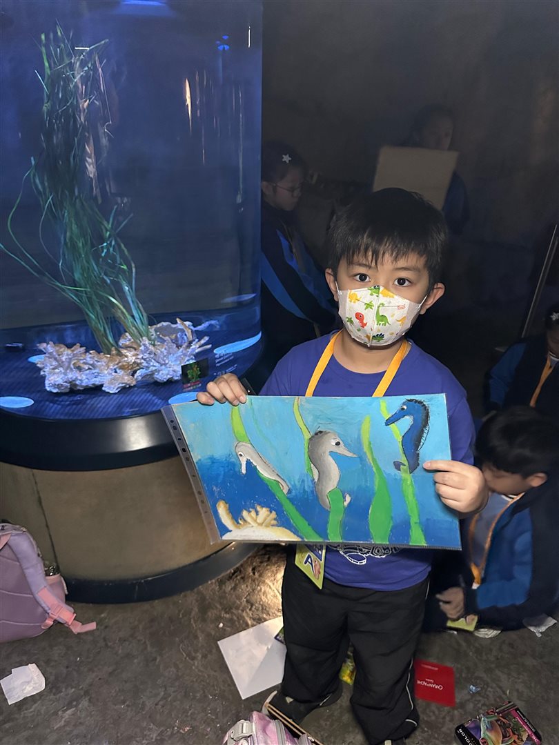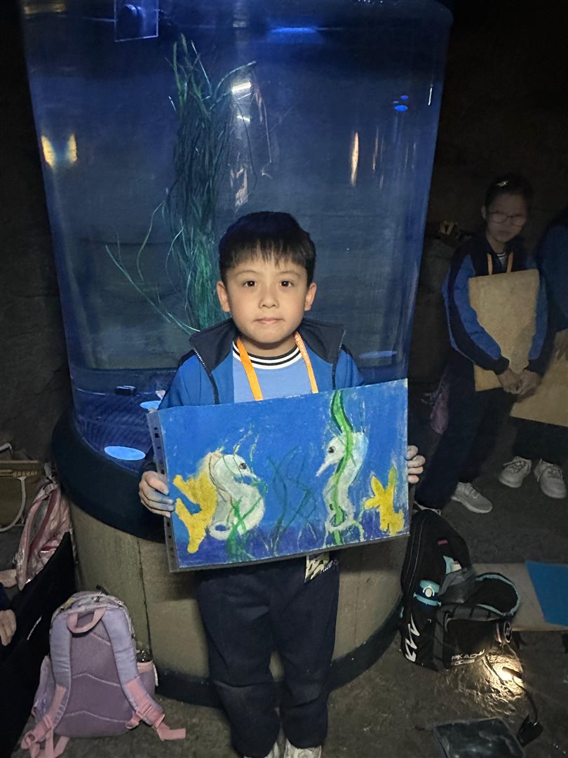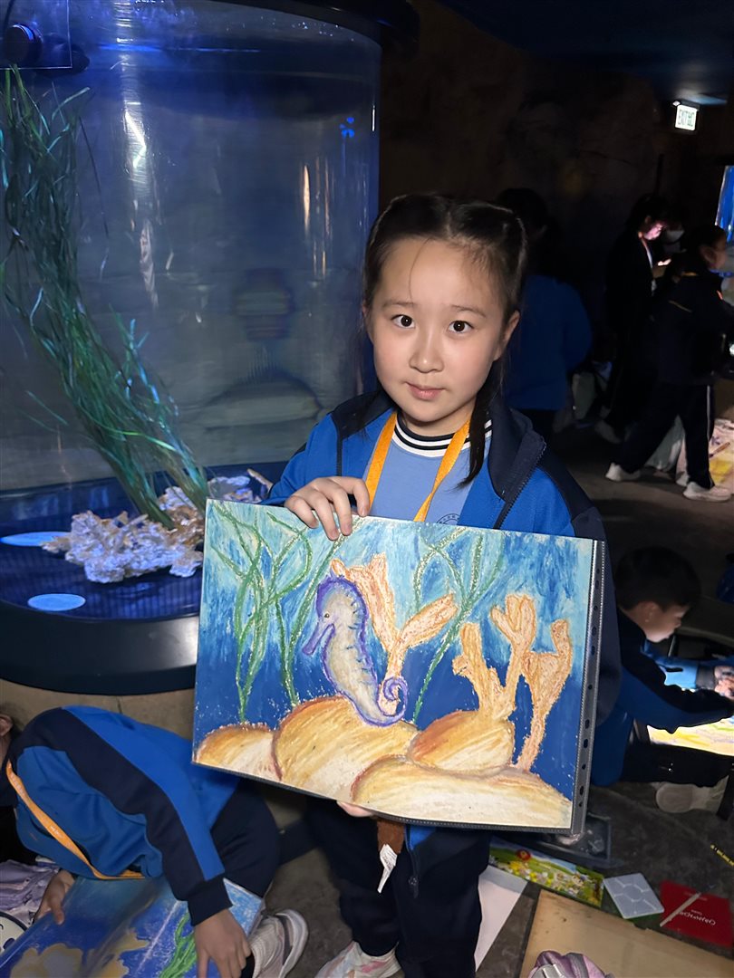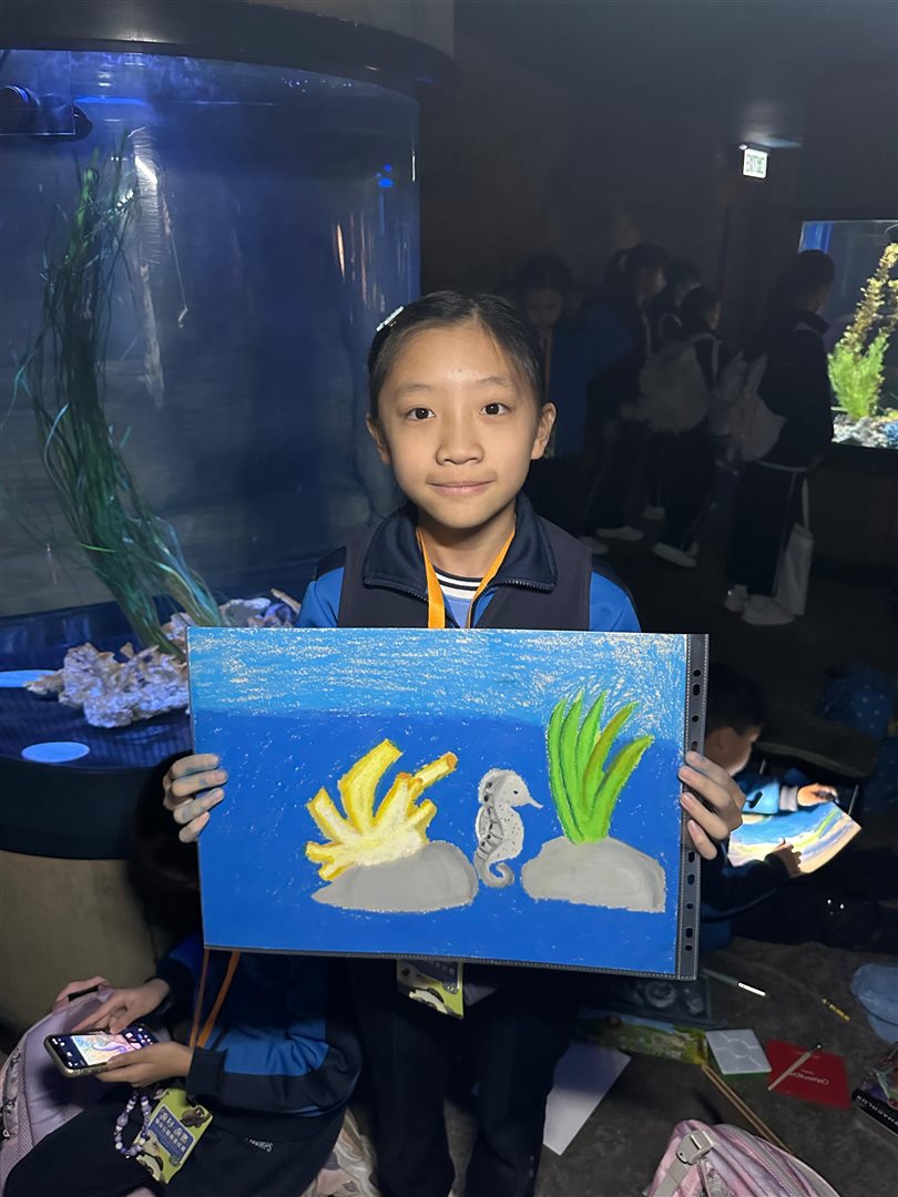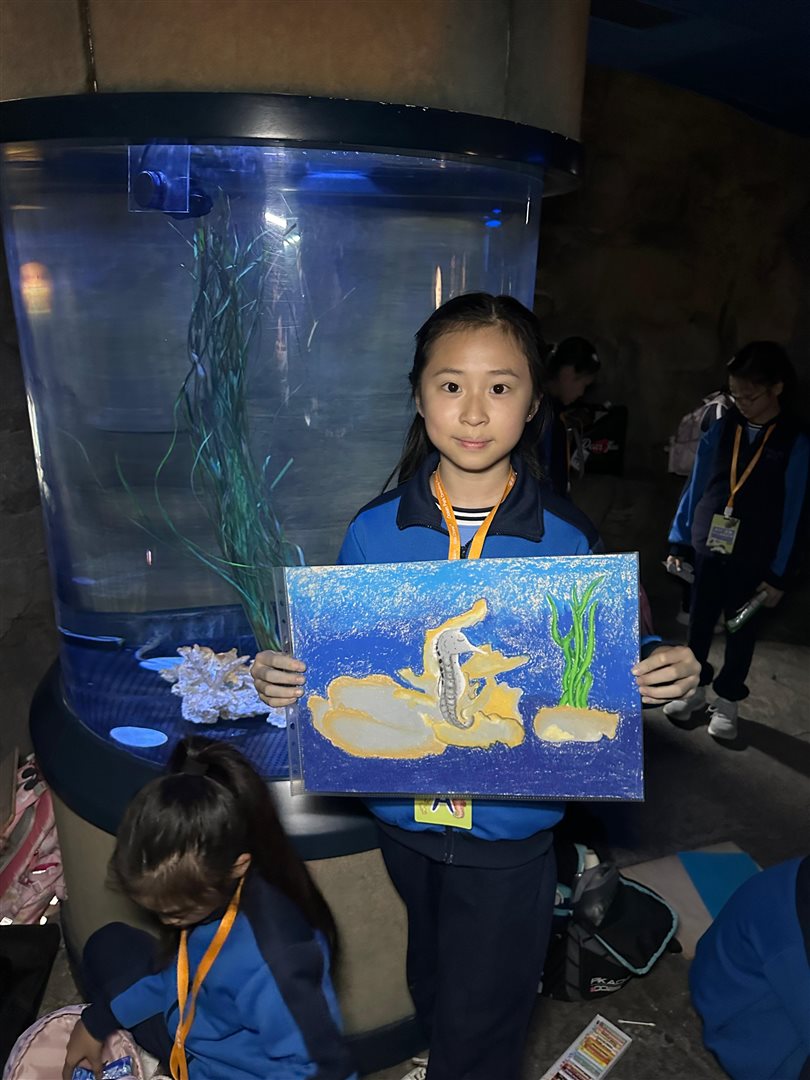 10位三至六年級視藝小達人,拿著大大小小的畫具走進香港海洋公園,參加由教育局課程發展處藝術教育組舉辦、香港海洋公園協辦的「邊學.邊畫」繪畫比賽。 同學們在水族館內細心觀察各種海洋生物,把眼前所見的姿態、色彩和神韻,一筆一畫描繪在畫紙上。 在創作過程中,大家不但發揮藝術觸覺和描繪技巧,也加深了對海洋資源、陸地生物保育及可持續發展的認識。 這次活動讓同學們一邊欣賞自然之美,一邊享受寫生樂趣,留下了難忘而充實的回憶。