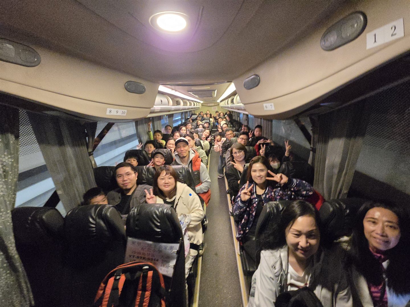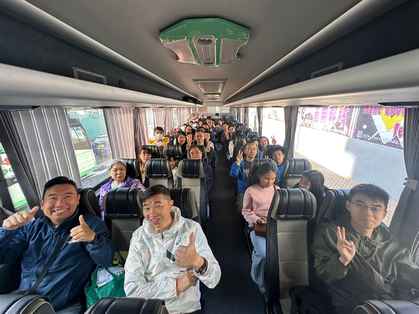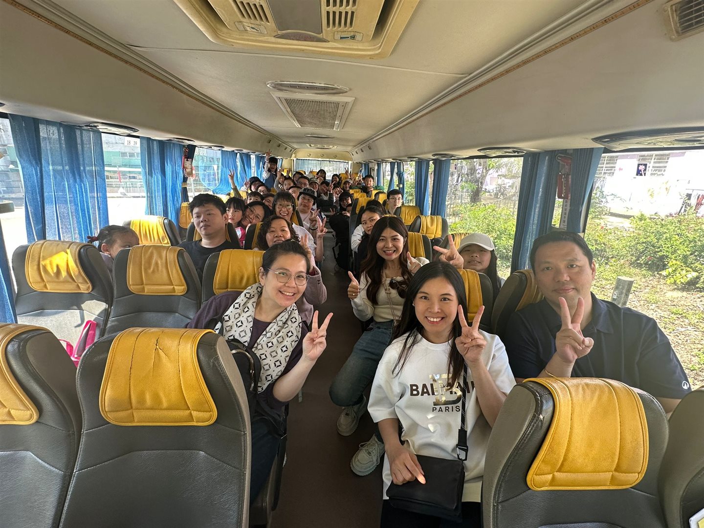 三架旅遊車載著老師與學生共156人,一路上笑語不斷。