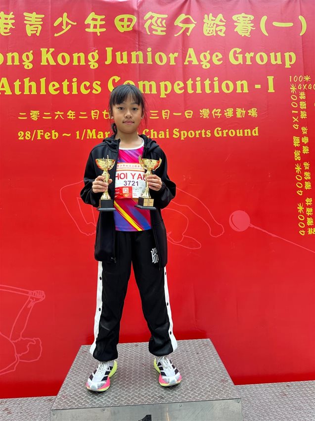 本校2位女子田徑隊隊員4E 黎暟柔及馬睿妍參加由康文署舉辦的「黃大仙區分齡田徑賽2025」,賽事於斧山道運動場舉行。黎暟柔同學在比賽中大放異彩,勇奪60米、100米及跳遠冠軍,其中60米更打破大會紀錄。此外,黎暟柔及馬睿妍同學在4X100米接力比賽中奪得亞軍,亦同時打破大會紀錄。 運動健兒們的表現,相信會激勵大家積極運動,未來挑戰更多比賽,展現無限潛力!
